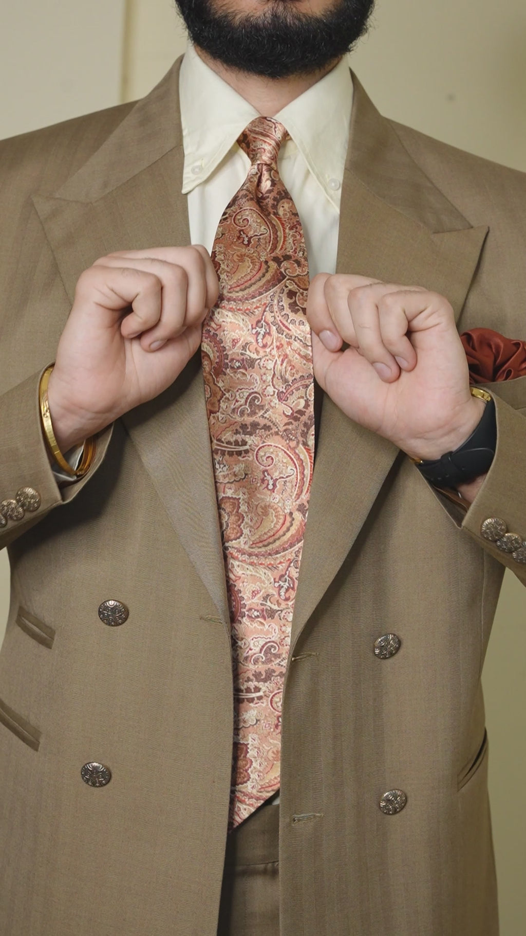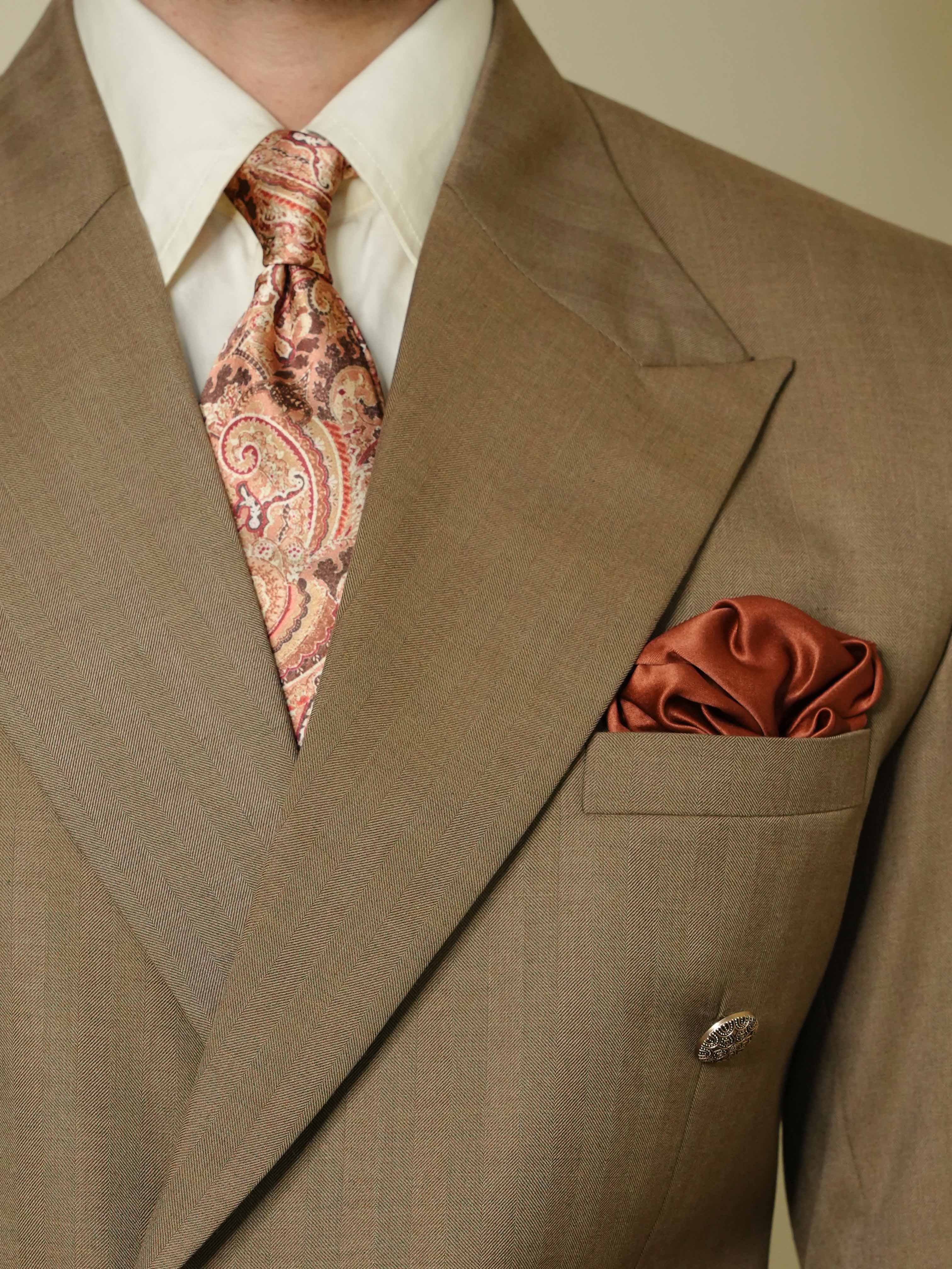 Elevate your formal wardrobe with the Rustic Brown Paisley Broad Tie Set, featuring a rich brown base adorned with intricate golden paisley patterns. Designed to create a refined contrast with a brown suit, this set includes a matching pocket square for a cohesive and polished appearance. Ideal for weddings and formal occasions, it adds a touch of timeless sophistication while ensuring your ensemble stands out with subtle elegance.